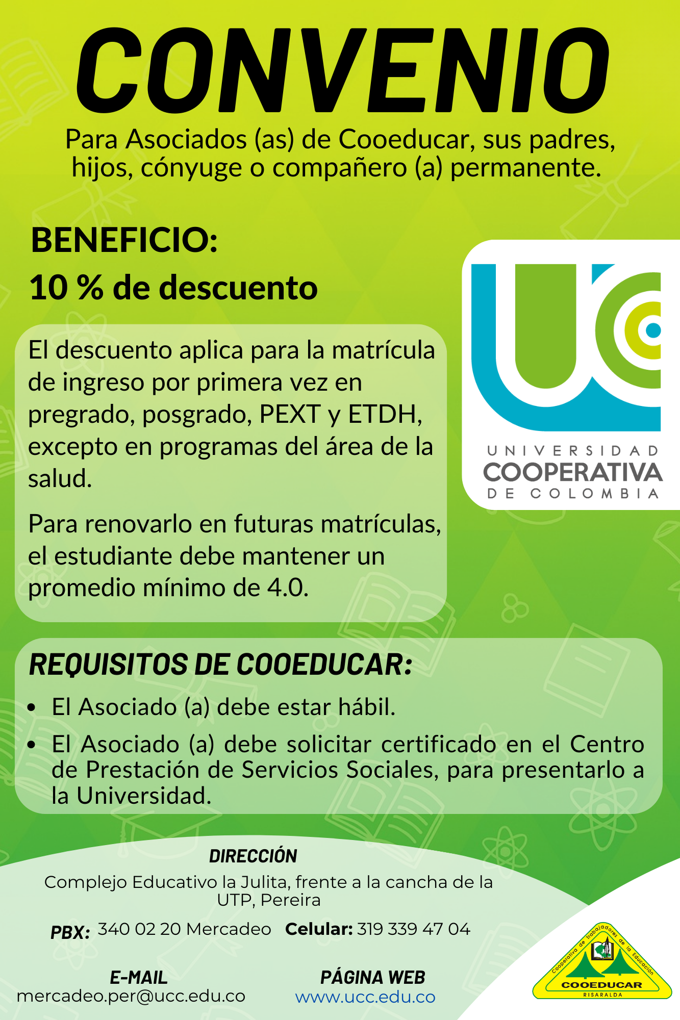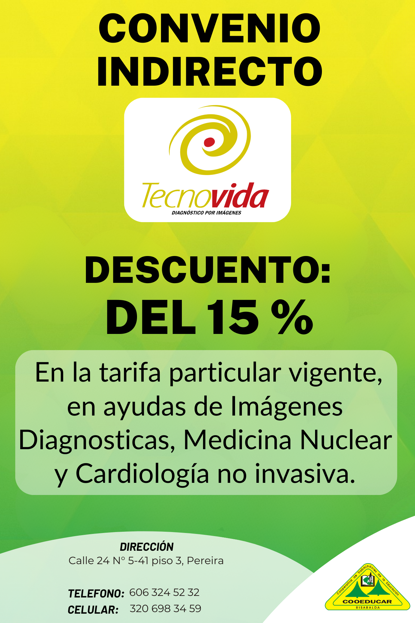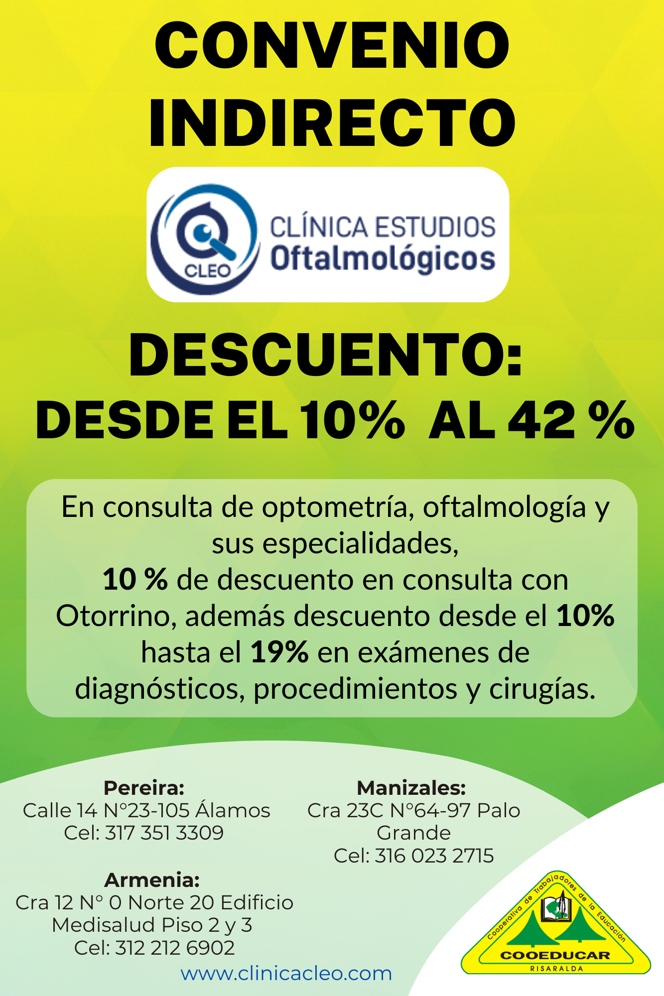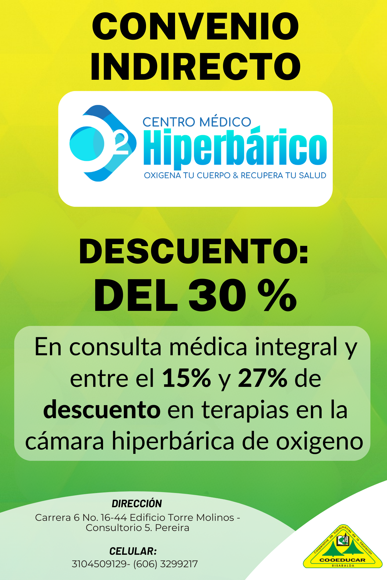 Para mayor información sobre los convenios que COOEDUCAR tiene para los asociados favor acercarse a las oficina de Servicios Sociales Cra 5 # 22-42.